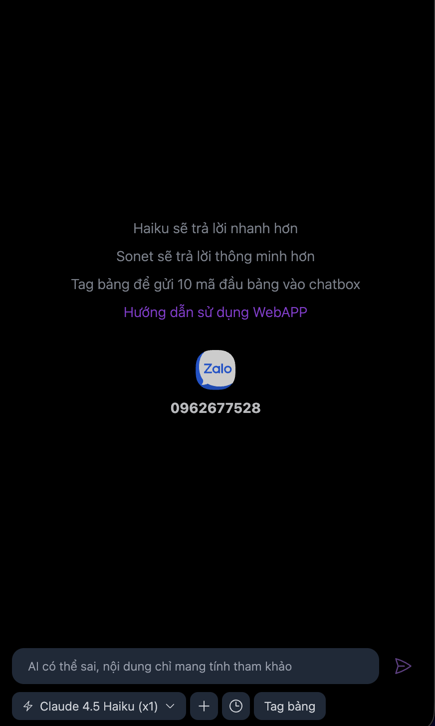| Claude Haiku 4.5 | 1 credit | Tra cứu nhanh, câu hỏi đơn giản |