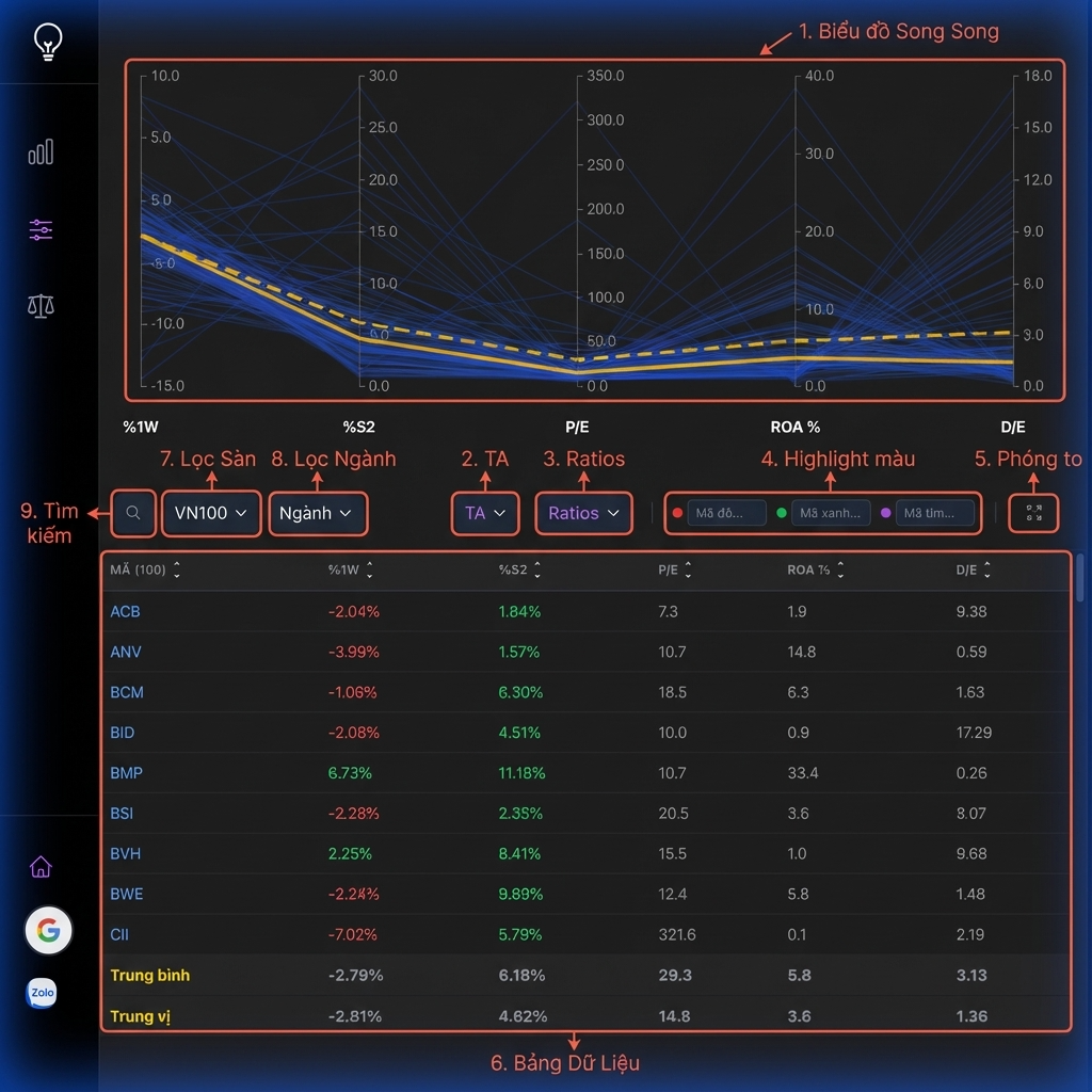 Trang Danh Mục Đầu Tư là công cụ giúp bạn phân tích và so sánh các cổ phiếu trên thị trường chứng khoán Việt Nam. Trang này kết hợp biểu đồ song song (Parallel Chart) và bảng dữ liệu tương tác để cung cấp cái nhìn toàn diện về các chỉ số kỹ thuật và cơ bản của hàng trăm cổ phiếu.